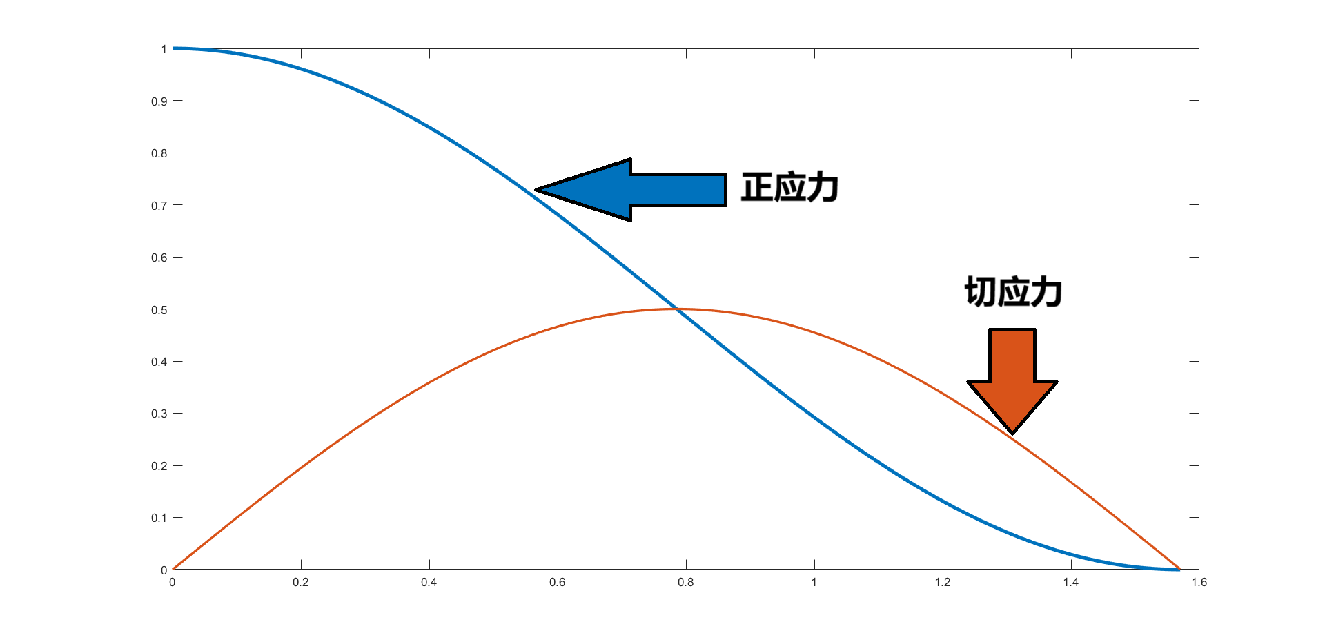 上面两个式子描述了某个斜截面的正应力和切应力与其对应的横截面所受到的正应力的关系。由此关系我们可以得到一些有趣的结论。下图是两个式子中 $\sigma$ 的系数随着角度 $\alpha$ 变化的图像。